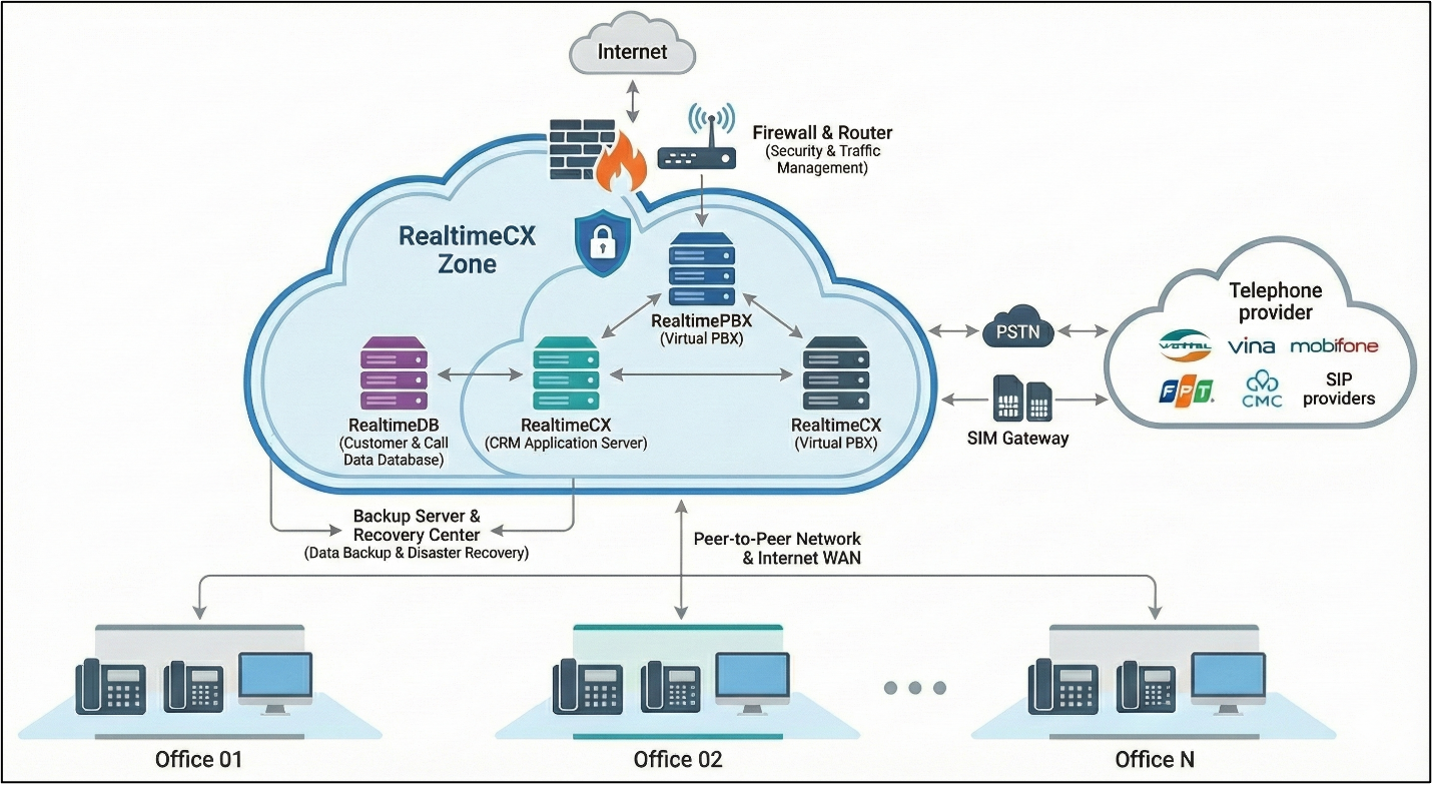 Hệ thống RealtimePBX được thiết kế theo mô hình tập trung – an toàn – dễ mở rộng: